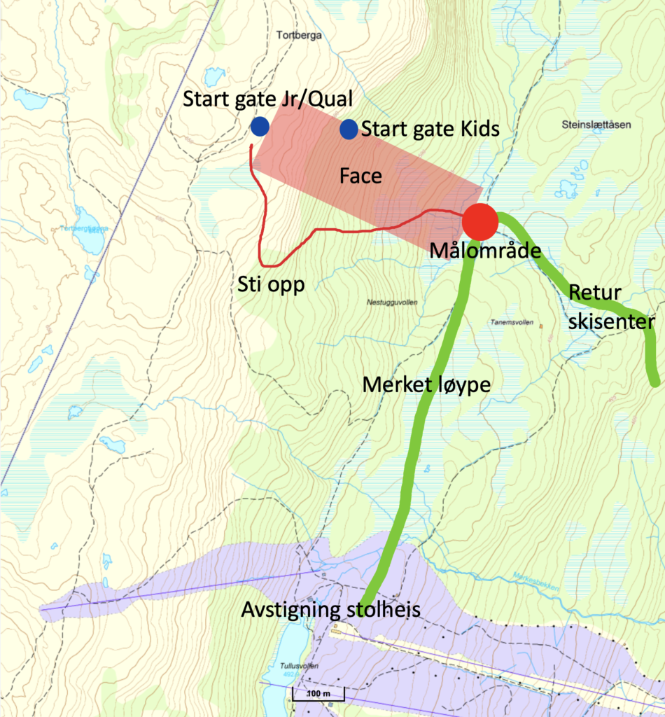 Konkurransefacen blir kalt for «Coronabollen». Fra avstigning stolheis vil det være skiltet løype til bunnen av facen. Det vil også være skiltet trasé til toppen av facen hvor starten skal være. Det er fortsatt ikke bestemt om deltagerne får gå i facen før konkurranserunnet. Dette vil bli diskutert på Riders Meeting fredag kveld. Avsperrede områder, samt innlagte hopp vil også diskutert på Riders Meeting.